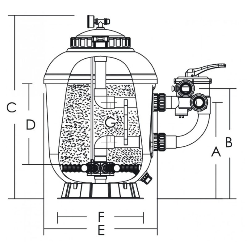 Φίλτρο άμμου πισίνας με πλευρική πολλαπλή φτιαγμένο από GRP και ενισχυμένο με υαλοΐνες που προσδίδουν μεγάλη μηχανική αντοχή και αξιοπιστία σε καθημερινή χρήση. Το φίλτρο διαθέτει διάφανο καπάκι οροφής για εύκολη επίβλεψη της κλίνης, καπάκι twist-lock, άψογο φινίρισμα πολυεστέρα με gelcoat και μέγιστη πίεση λειτουργίας 2,5bar.